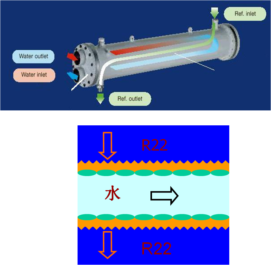 1. 殼管式熱交換器采用高效的雙螺紋銅管,提高了殼側制冷劑以及管側冷卻水間的熱交換效果,比普通傳熱銅管換熱效率提高達30%左右。